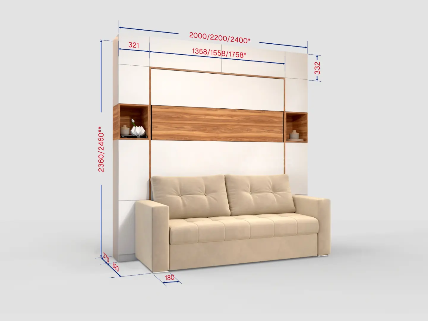 Дополнительные опции, такие как: освещение, зарядное устройство, розетки, мягкое изголовье, матрас, мягкий борт - не входят в стоимость шкаф-кровати "Comfort Space Balance". Вы всегда можете самостоятельно их добавить в опциях или написать менеджеру при оформлении заказа.
